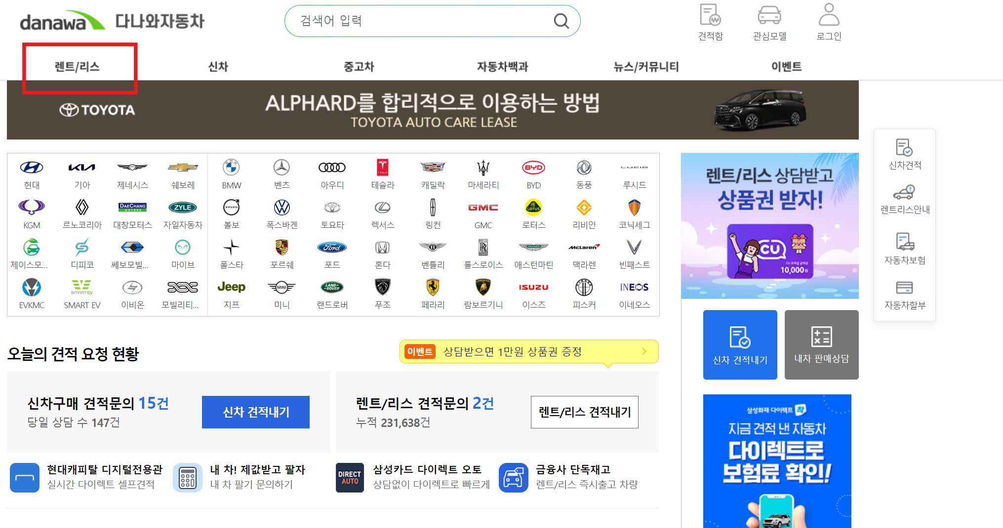 - 다나와 자동차에서 렌트/리스 섹션을 클릭하면 월렌트가 나와요.