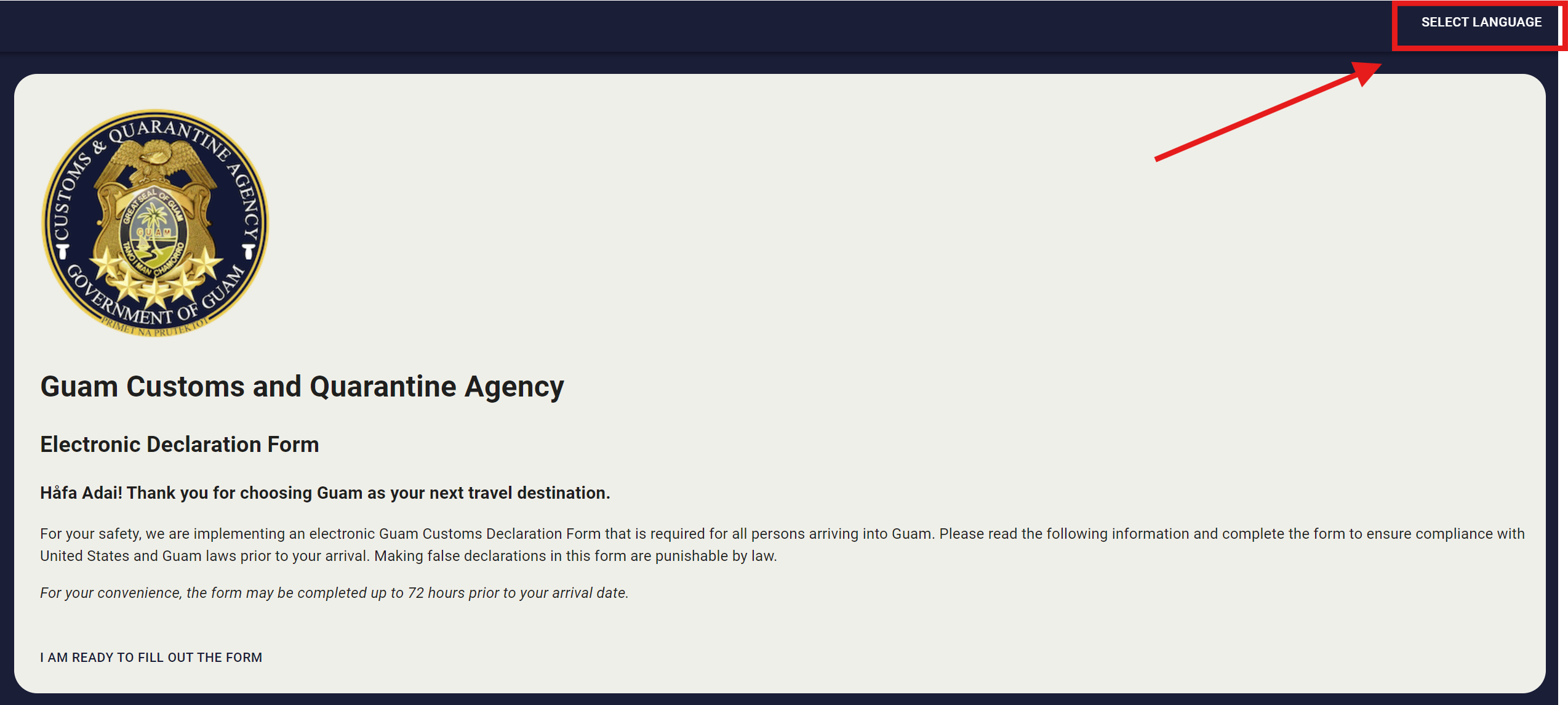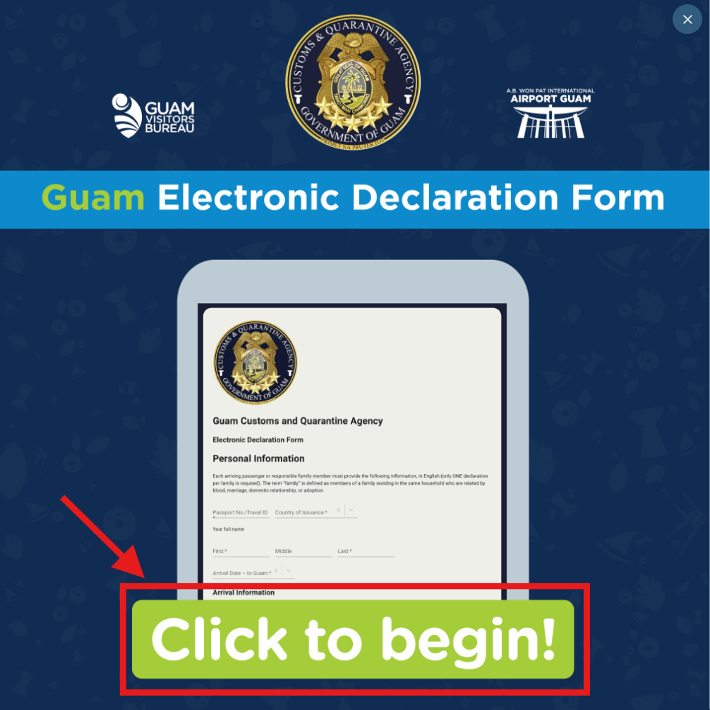 1. 괌 전자세관 신고 홈페이지에 접속해서 Click to begin을 클릭하세요.