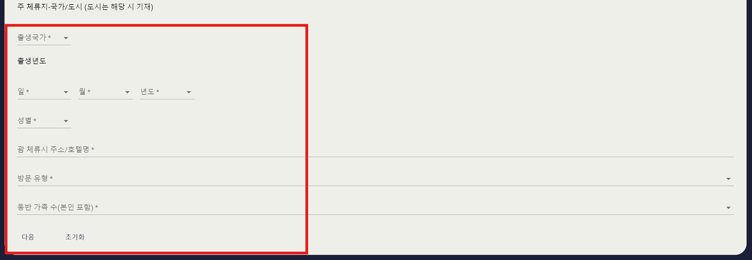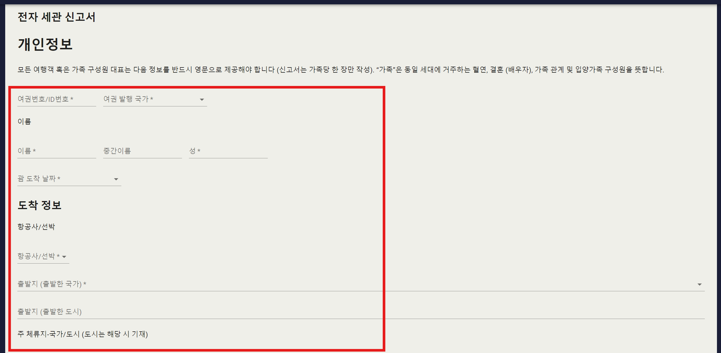 - 체류기간, 방문횟수, 체류장소, 여행목적, 여행 예약정보, 연락처를 순서대로 기입