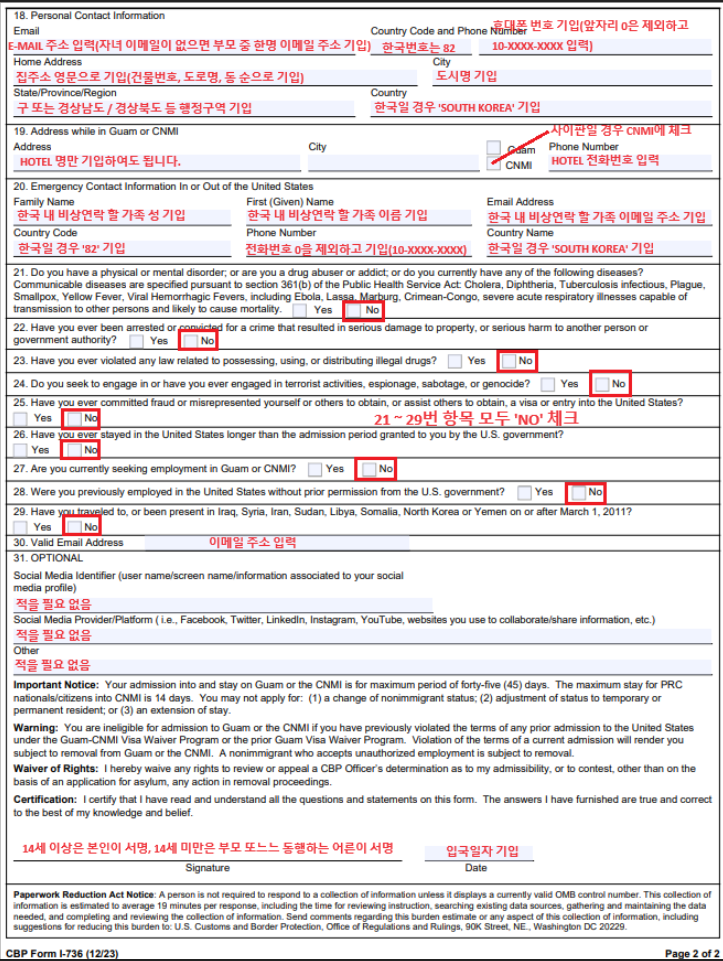 괌 비자면제 신청서 작성방법 (샘플)