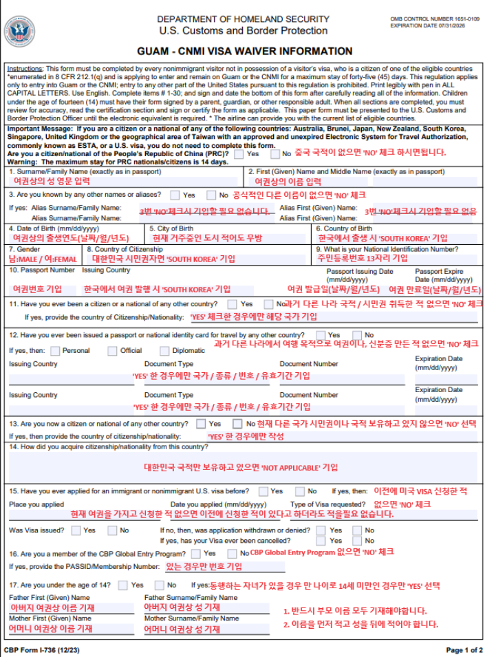 미국 및 괌 법률에 따라 괌에 입국하는 모든 승객은 괌 전자 세관신고서를 의무적으로 작성해야 합니다. 그리고 비자가 없더도 괌입국이 가능하지만 미국비자가 없는 사람은 별도로 비자면제 신청서를 작성해야합니다. 원활한 괌입국을 위해 지금 바로 전자세관신고서와 비자면제 신청서 작성하세요!