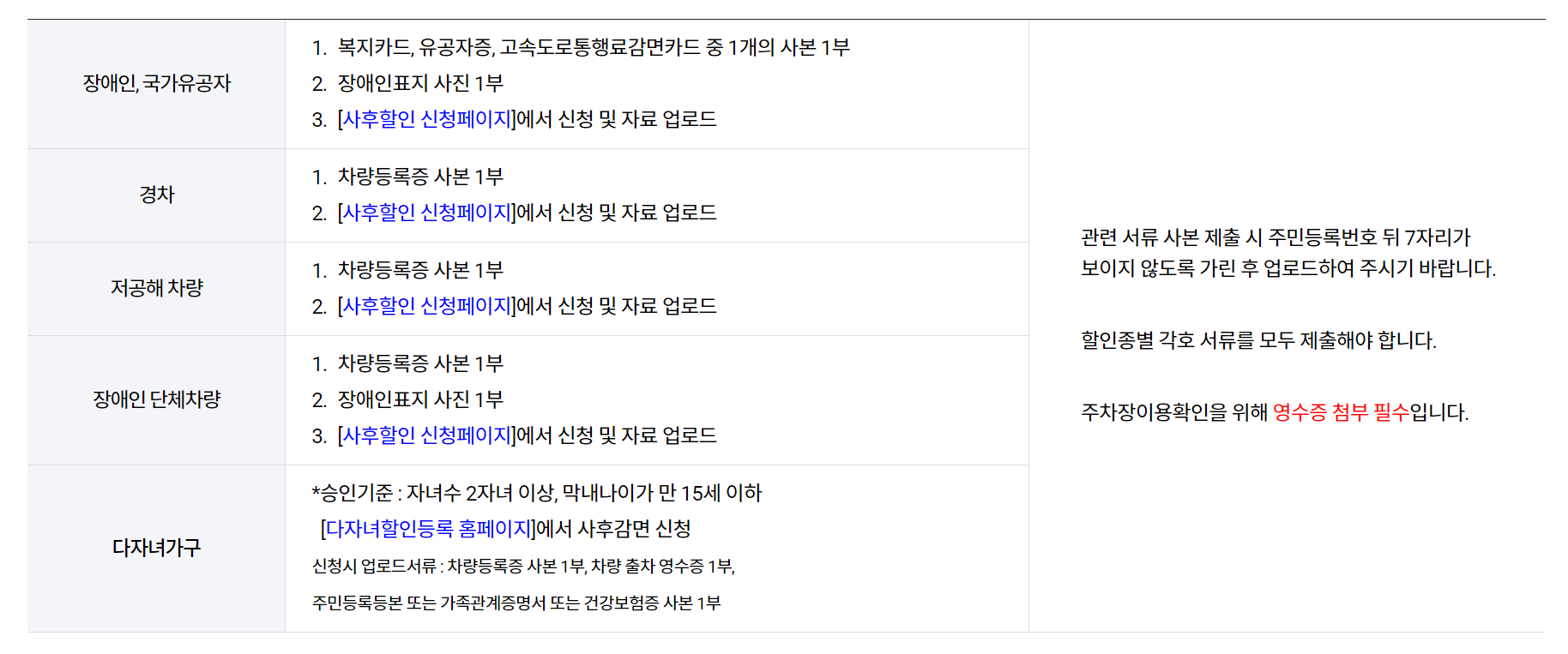 * 사후할인의 인정 - 증빙서류 미비 등으로 출차 시 할인을 받지 못한 경우 ! - 각각의 사유에 해당하는 관련서류 일체를 출차 후 30일 이내에 사후할인 신청페이지에 신청하시면 출차기록과 대조하여 할인금액을 환불하여 드립니다. ※ 신용카드, 체크카드로 결제하신 경우 출차시 완납한 금액에서 사후할인 인정금액만큼 부분취소 처리됩니다. |