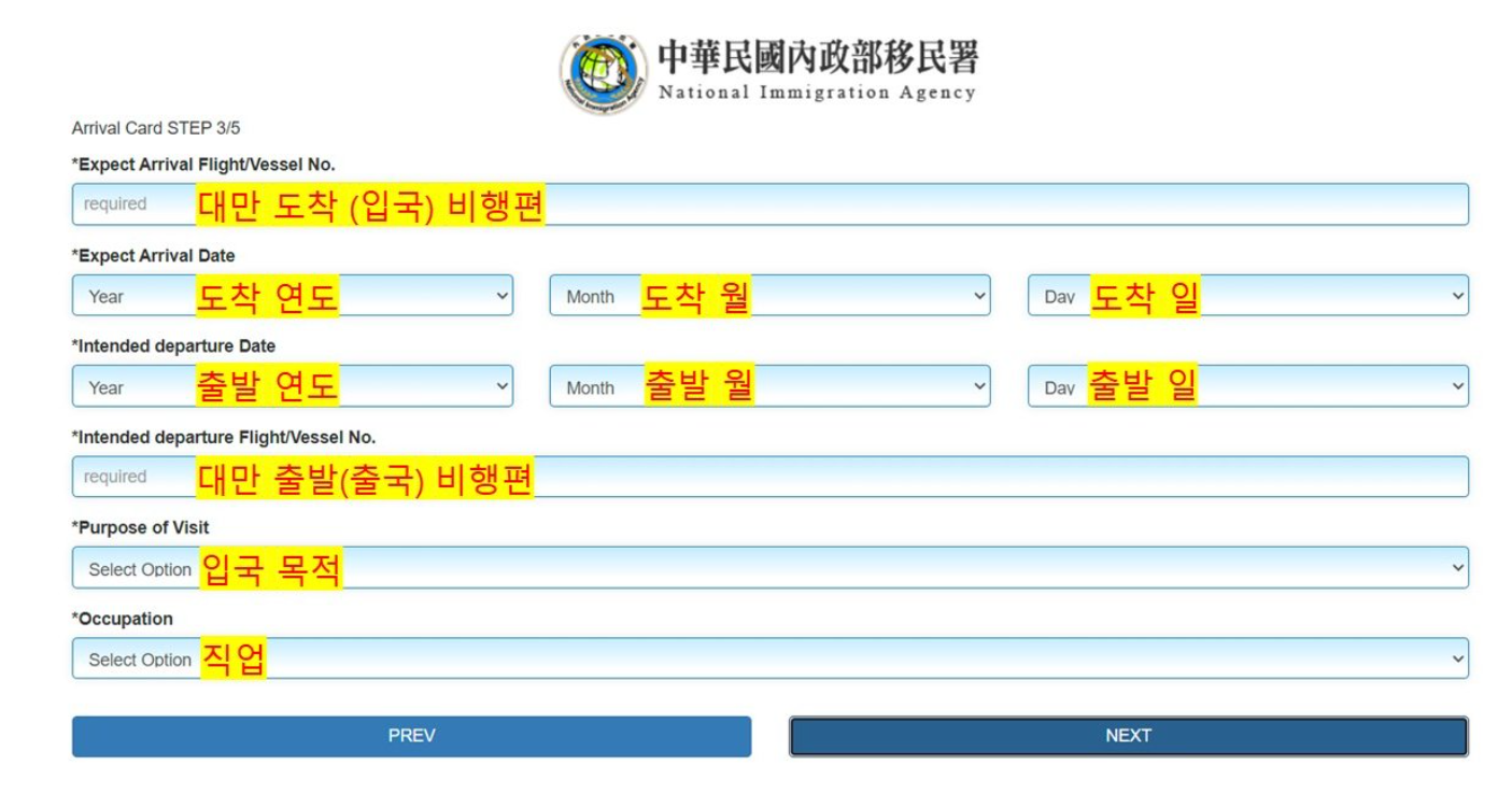 - 출발/도착 날짜. 항공기 편, 입국 목적과 직업을 작성해요.