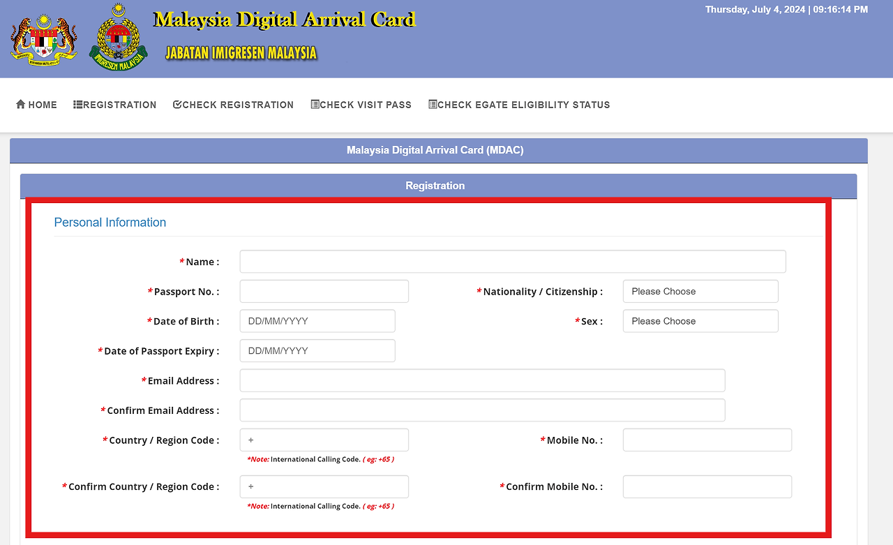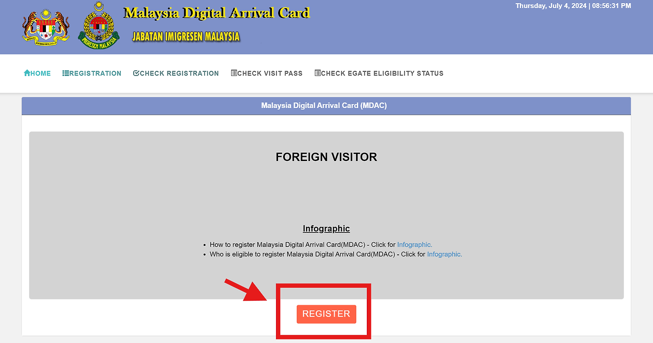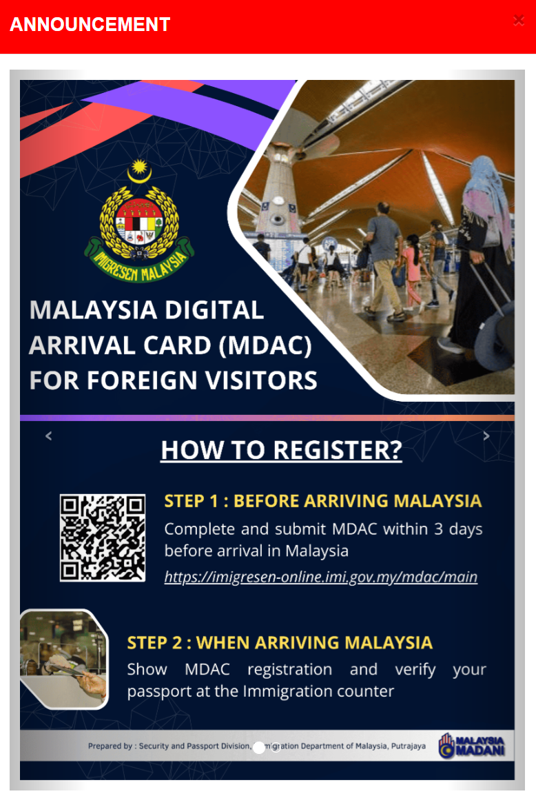 - (등록일을 포함하여) 도착전 3일 이내 말레이시아 디지털 입국 카드(MDAC) 등록해야함.