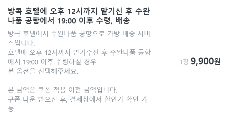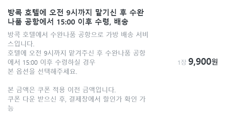 - 방콕 호텔에서 수완나폼 공항으로 보내는 가방의 경우 시간대 ( 9시~ 15:00, 12~19:00)에 맞게 선택하면 됩니다.