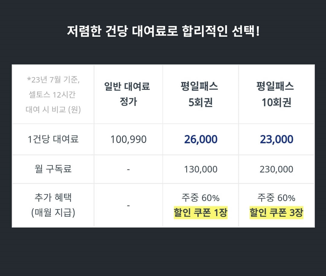 : 평일 12시간 23,000원으로 월요일부터 금요일까지 원하는 시간에 이동할 수 있어요. 차량은 물론, 별도 주차비용 없이 효율적인 외근 및 출장이 가능해요.