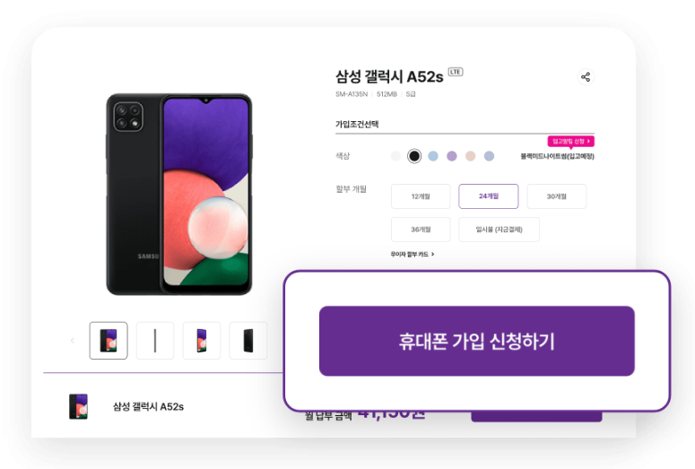 - 개통을 희망하는 휴대폰과 요금제를 선택한 후 ‘휴대폰 가입 신청하기’ 버튼을 선택하여 가입신청서 화면으로 이동합니다.
