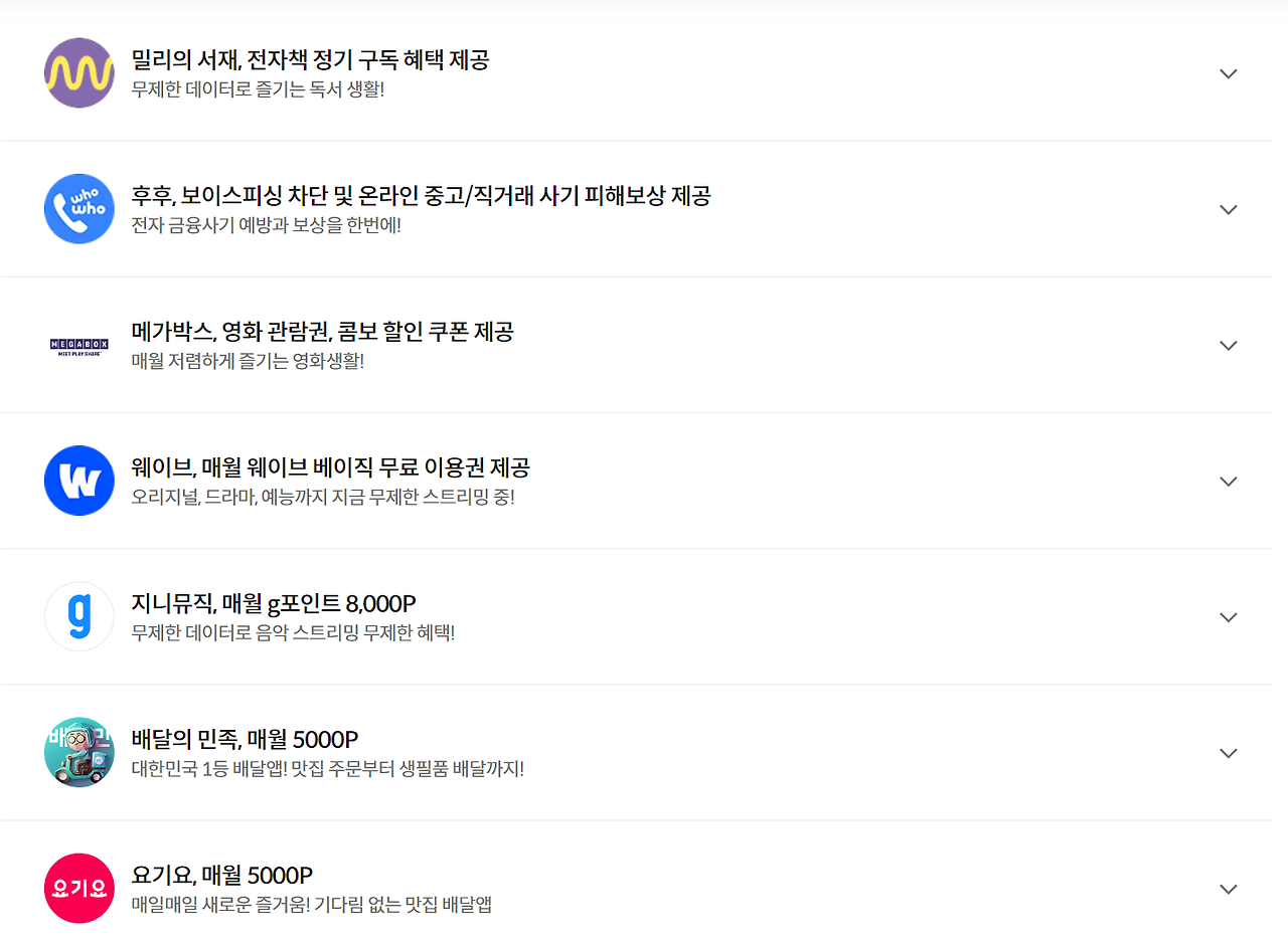 - 특히, 밀리의 서재, 메가박스, 왓차의 경우 제휴 요금제를 활용하면 문화생활에 대한 추가 비용을 절약할 수 있습니다.