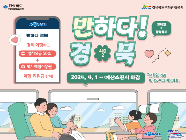 반하다. 경북! 이라고 들어보셨나요? 코레일과 경상북도 문화관광공사가 협력하여 만든 여행지원 상품인데요. 경북지역을 관광시 최대 4명까지 열차요금과 식음료 50%를 지원받을 수 있습니다. 2024년 4월부터 이용이 가능하고 예산이 소진되면 더 이상 혜택을 받을 수 없으니 지금 확인하시고 할인혜택 꼭 받으시기 바랍니다.