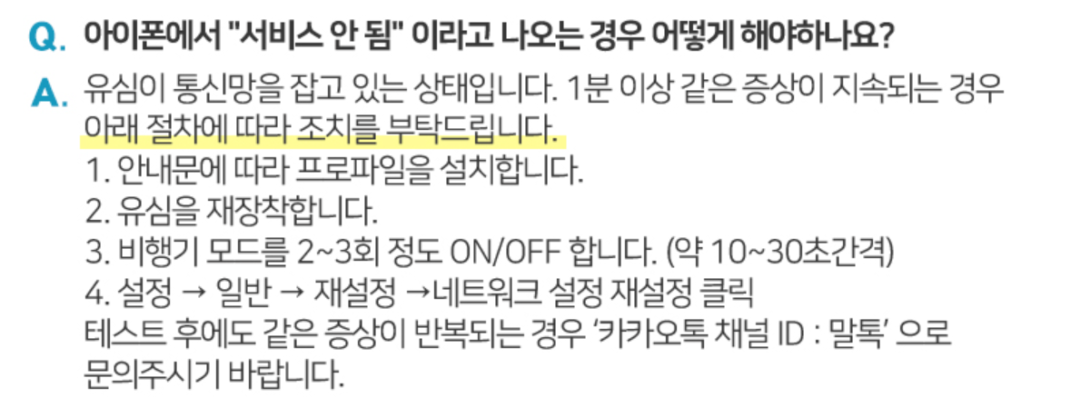 4) 아이폰에서 "서비스 안됨"이라고 나오는 경우, 아래 절차에 따라주세요.