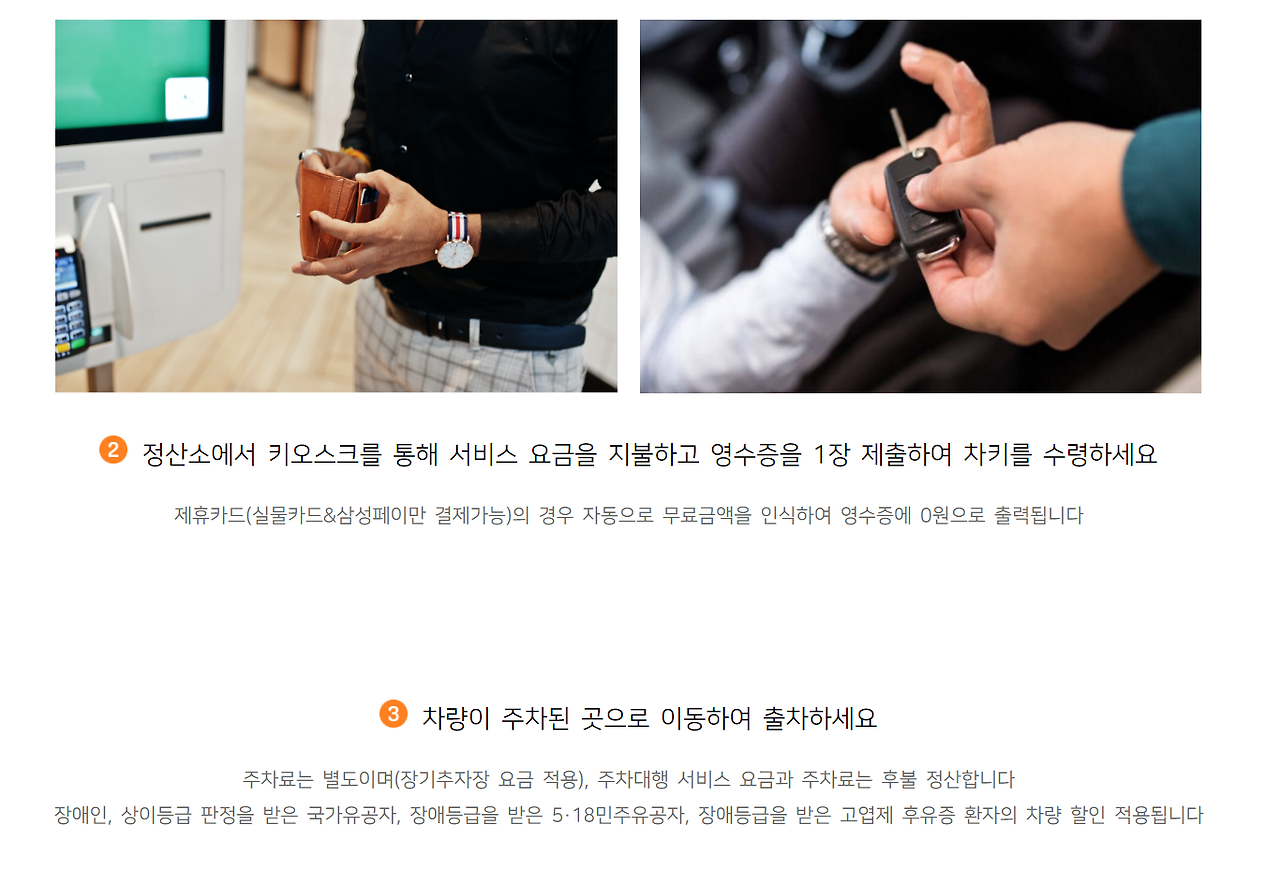 - 주차대행 공식업체 직원은 주황색 유니폼을 착용하고 있어 이용할 때 편리해요!