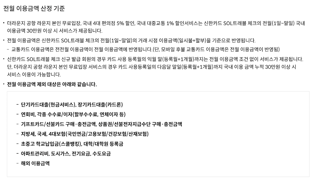 * 신한카드 SOL트래블 체크의 전월(1일~말일) 국내 이용금액 30만 원 이상 시 서비스가 적용됩니다!