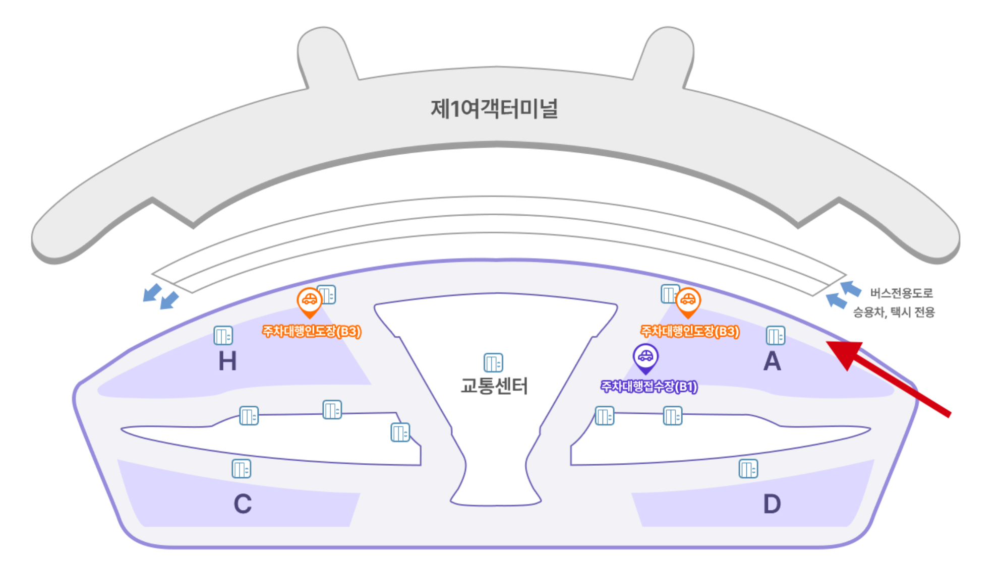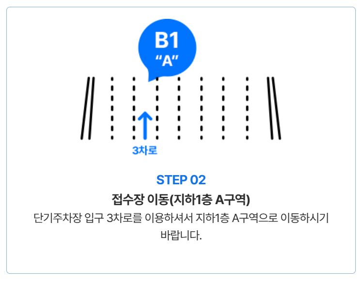 - 단기주차장 지하1층 주차대행 전용 접수장을 제외한 타 주차구역에 주차 시 단기주차장 요금이 발생합니다.
