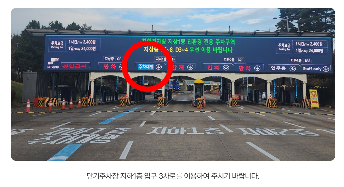 (아래 사진에 주차대행 표지판이 있는 3차로 입구 이용하세요! )