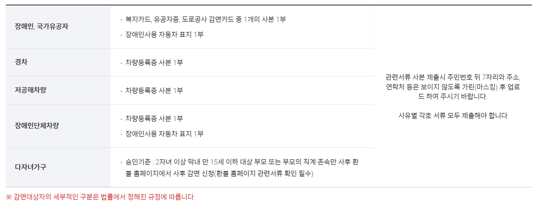 경차/장애/유공자/다자녀/ 저공해차량(1, 2종)은 50%, 저공해차량 3종은 20~50% 감면
