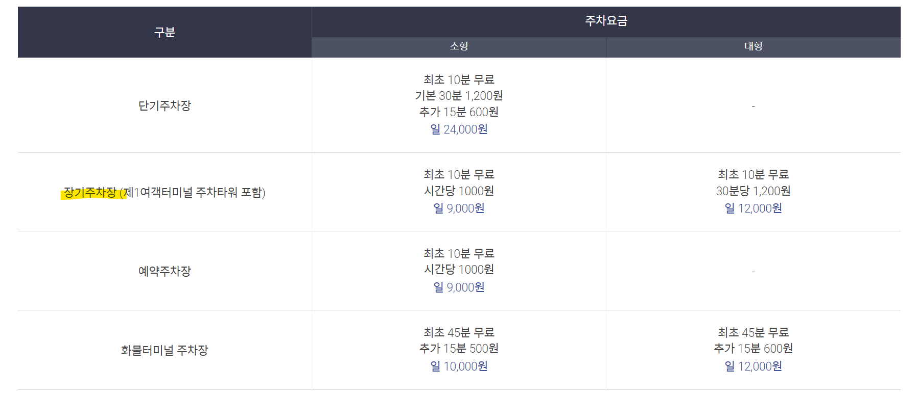 - 장기주차장 요금은 일 9000원 (소형) or 12000원 (대형)