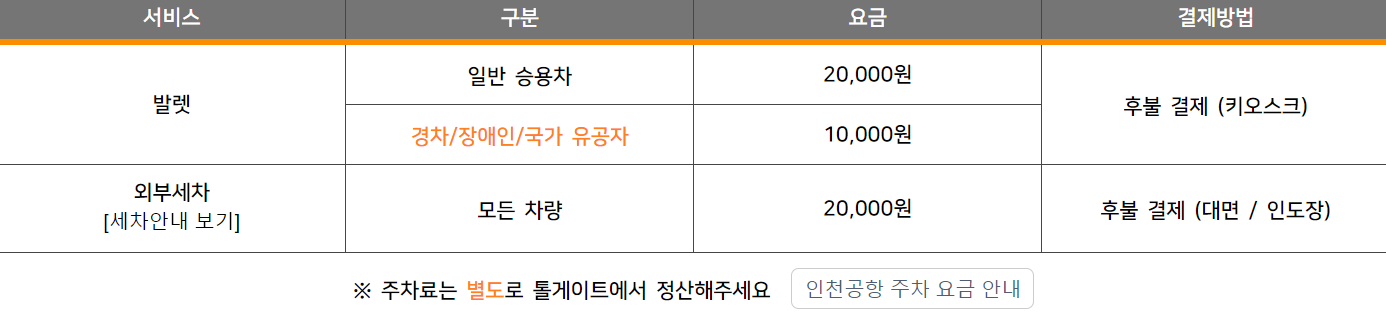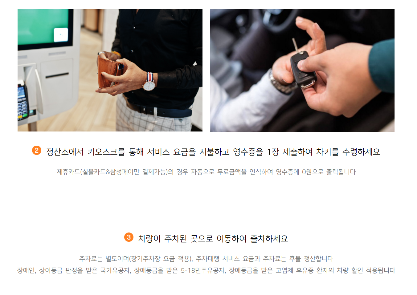※ 주차 요금을 결제 전에 반드시 <주차대행료>를 결제 해주십시오. 먼저 주차요금을 결제 할 경우 추가 주차요금이 발생합니다.