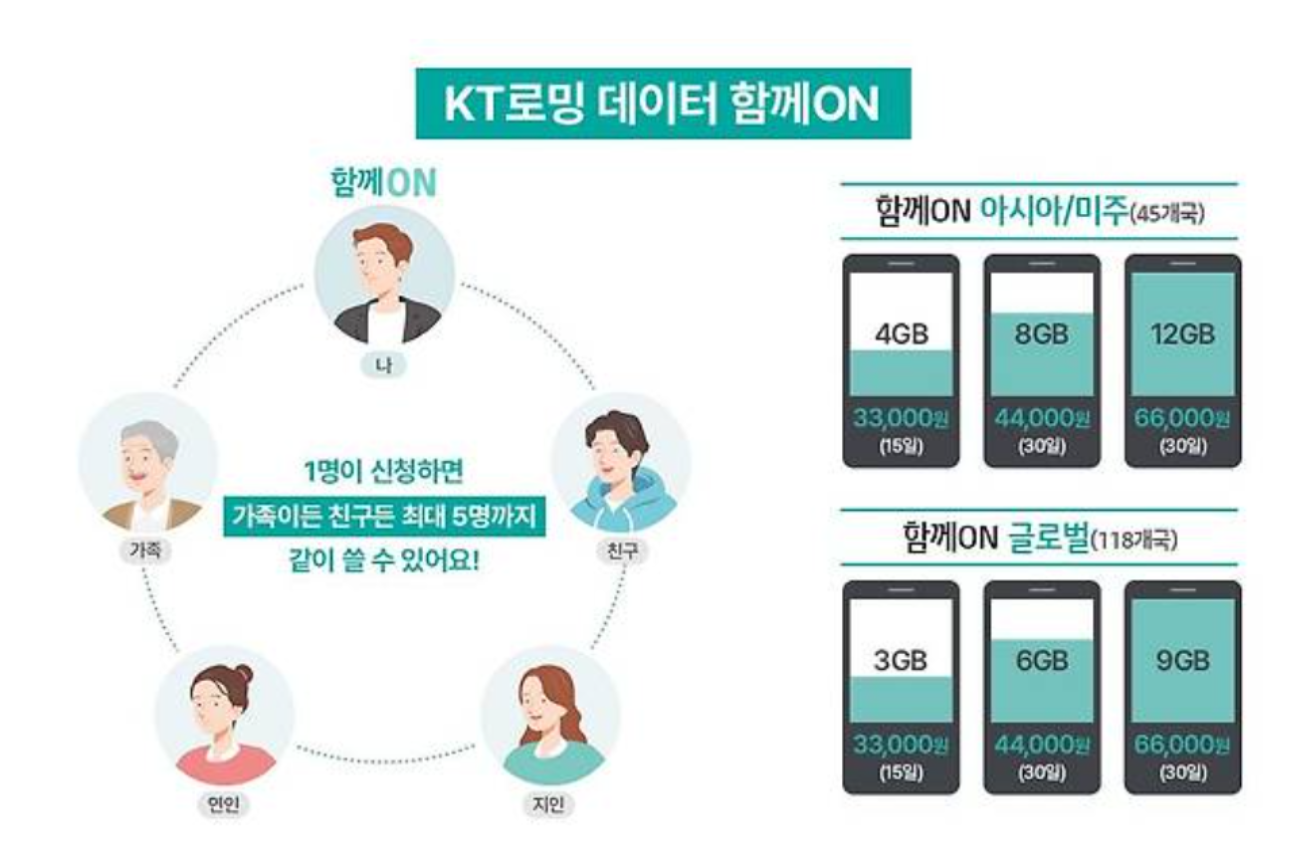 1. KT해외로밍 - 데이터 함께 ON 요금제 - 로밍 데이터, 통화, 문자이용! / 친구 2명은 무료! (1) 데이터함께 ON 아시아/미주 (2) 데이터함께 ON 글로벌 KT해외로밍 - 데이터 함께 ON 아시아/미주 (2명은 무