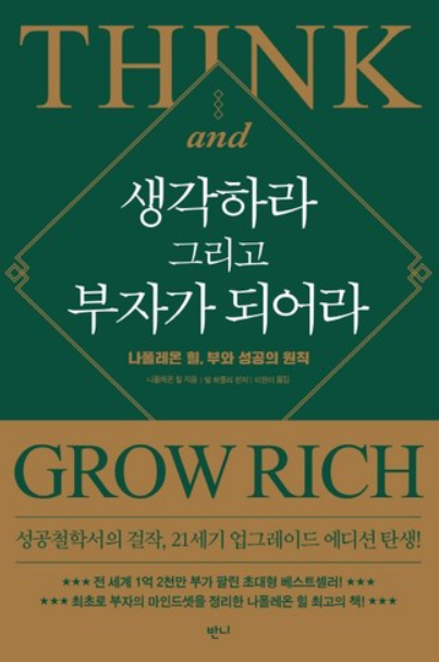 "생각하고 부자가 되자(Think and Grow Rich)"는 전 세계 수백만 명의 독자에게 영감을 준 획기적인 자기 계발 책입니다. 오랜 시간 동안 여러 세대의 기업가와 독자들에 큰 영감을 주었습니다. 나폴레옹 힐(Napoleon Hill)은 이 책에서 긍정적인 사고, 목표 설정, 재정적인 성공을 이루는 끈기의 힘을 설명합니다. 또한 Andrew Carnegie, Henry Ford, Thomas Edison과 같은 성공한 개인과의 인터뷰에서 통찰력을 얻은 Hill은 욕망을 유형의 부로 바꾸는 단계별 철학을 공유합니다. 이 책은 재정적 조언뿐만 아니라 개인 개발에 대한 전체적인 접근 방식을 제공하므로 번영과 풍요를 추구하는 모든 사람에게 시대를 초월한 교육자료가 될 수 있습니다. 긍정적인 사고, 시각화, 명확한 목표 설정의 힘을 강조하는 이 책은 끈기의 중요성, 잠재의식을 지배하고 성공에 대한 불타는 열망을 키우는 것의 중요성에 대해서도 강조합니다. 그의 가르침은 개인이 자신의 꿈을 추구하고 잠재력을 최대한 발휘할 수 있도록 좋은 지침서가 되고 있습니다.