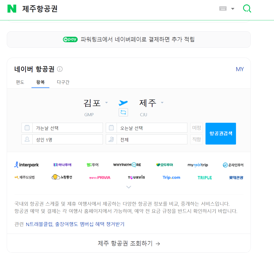 네이버항공으로 가서 원하는 출발날짜, 출발지, 인원 등을 입력하고 제주항공권 검색을 클릭하면 가격이 낮은 순으로 리스트업 해줍니다.