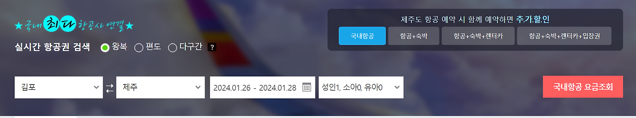 넥스투어, 제주도닷컴, 땡처리닷컴, 하나투어, 모두투어 의 [항공권 + 숙박 + 렌트] 패키지상품들을 미리 검색해 추가할인을 확인해 보세요.