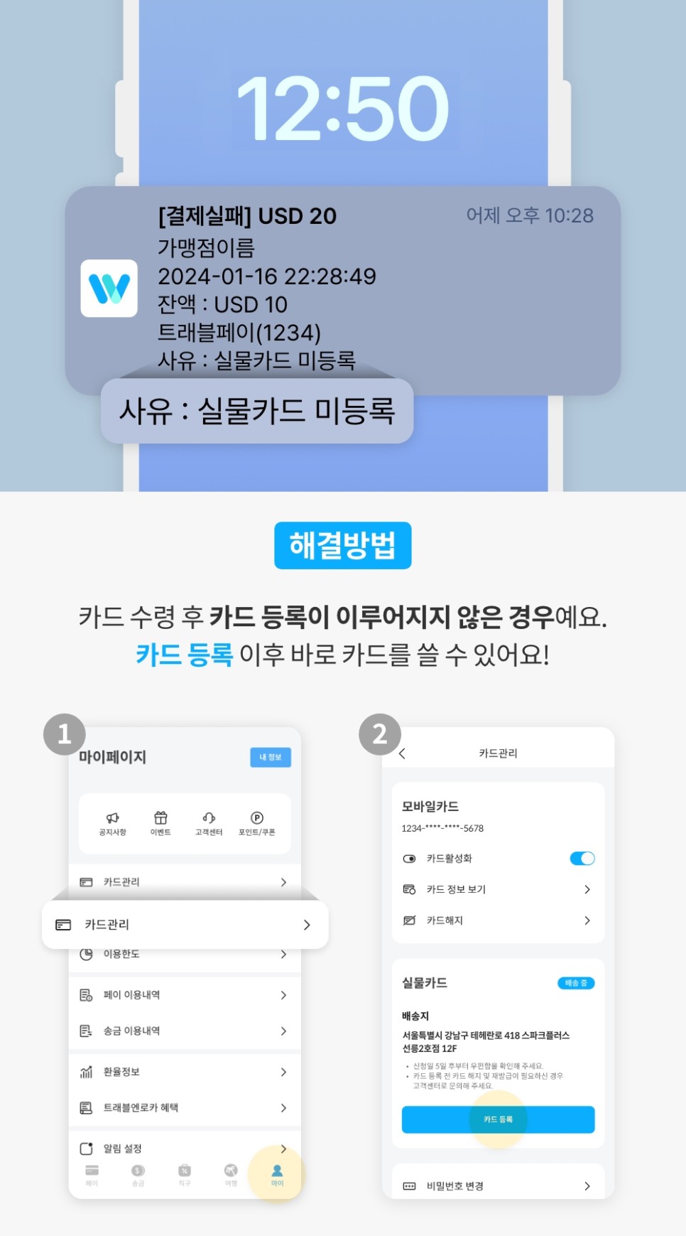 - 실물카드를 수령한 뒤 카드등록이 하지 않으면 결제실패 메시지가 뜹니다.