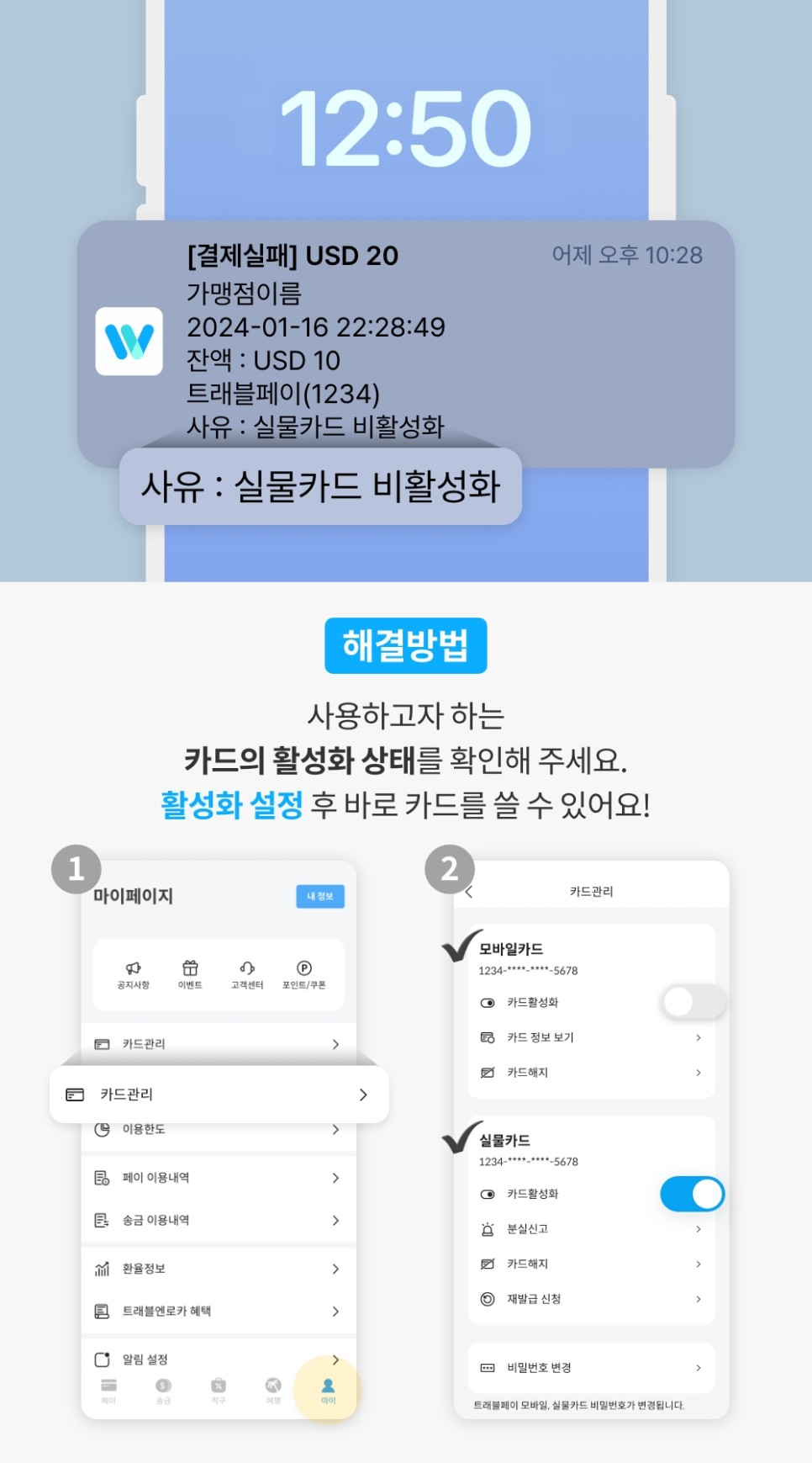 - 결제를 시도한 트레블월렛 카드가 비활성화 처리된 경우 이런 메시지를 받을 수 있습니다.