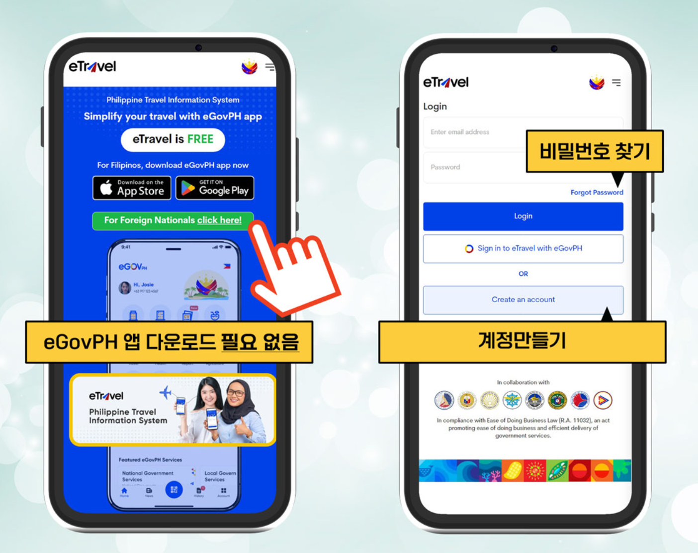 - 이트래블을 등록함으로써 종이로 된 입국신고서를 작성하지 않고 편리하고 신속하게 필리핀을 입국할 수 있습니다.