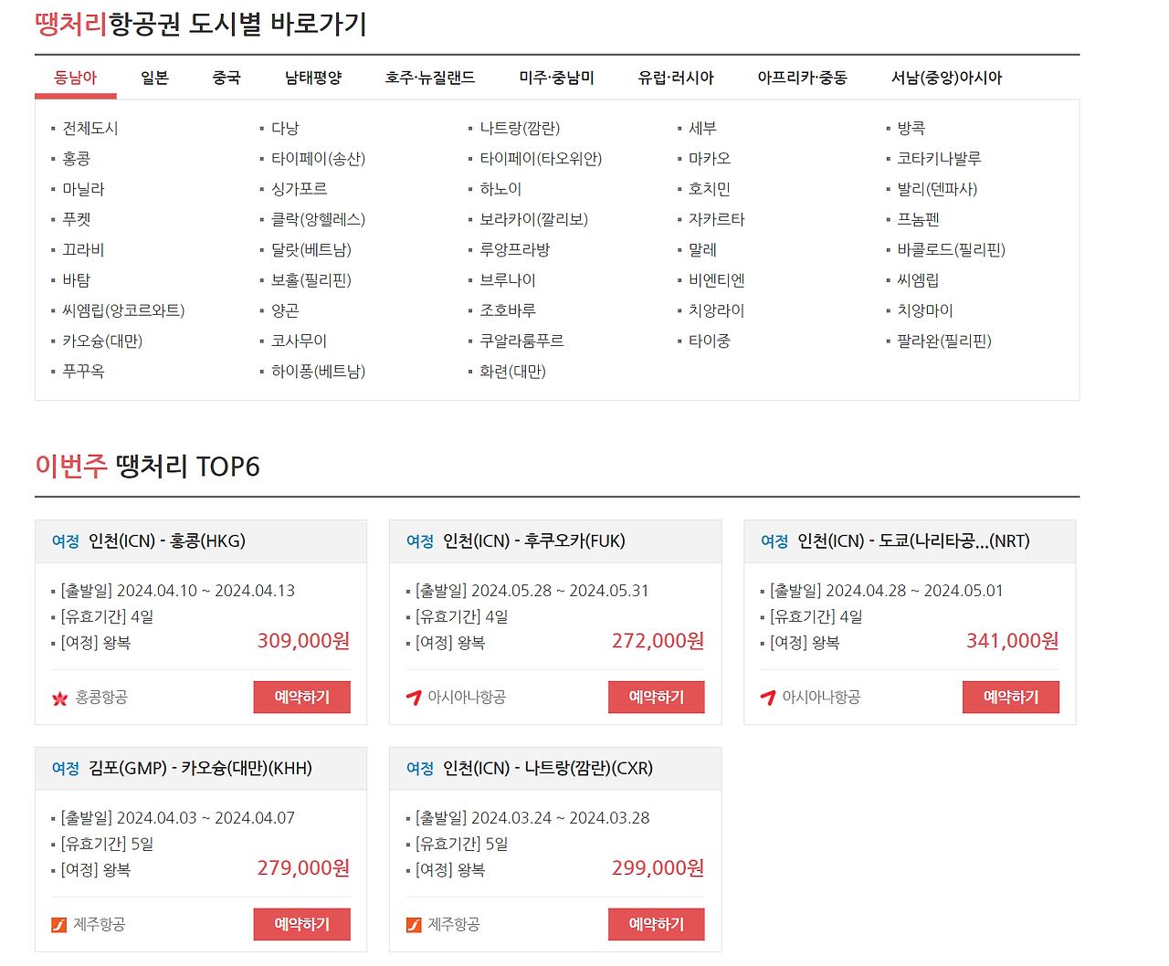 - 이번주 땡처리 TOP6 외에도 부산이나 청주처럼 지방 출발 땡처리 TOP 6에 저렴한 상품이 많습니다.