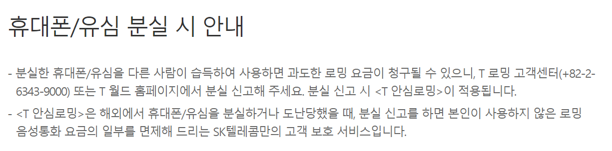 - 휴대폰을 습득한 사람이 함부로 사용하면 과도한 로밍 요금이 청구될 수 있으니, T 로밍 고객센터(+82-2-6343-9000, T 로밍 이용 시 무료)에 바로 신고해 주세요.
