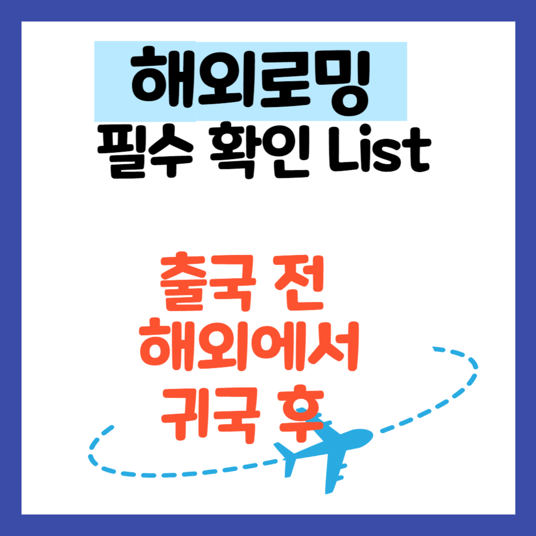해외로밍을 준비 중이신가요? 출국 전, 해외에서, 귀국 후 해외로밍 준비를 위해 필수적으로 확인해야 할 내용들을 정리해 보았습니다. 해외로밍을 제대로 세팅하지 않으면 데이터 사용이 원활하지 않고 로밍 요금 폭탄을 맞기도 하니 출국전에 꼼꼼하게 준비하세요.