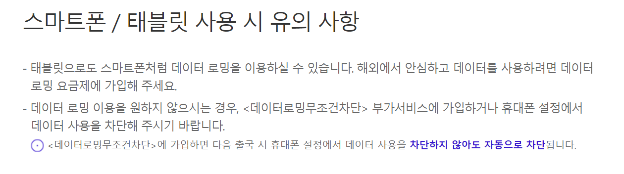- 기간형 로밍 요금제의 이용 기간이 끝나면 데이터 로밍이 자동으로 차단됩니다. 해당 요금제를 이용하셨던 적이 있는 고객님은 새로 T 로밍 요금제에 가입하시거나 <데이터로밍차단> 부가서비스를 해지해 주세요.