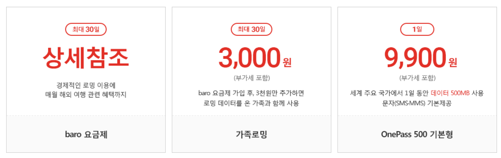 baro 3/6/12/24GB, OnePass 500/VIP/Data VIP 등의 로밍 요금제에 가입해 주세요. 해외에서도 가입 후 바로 이용하실 수 있습니다.