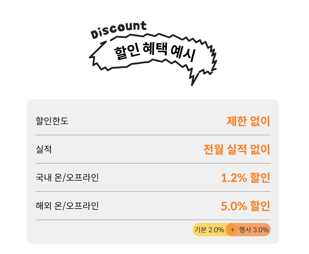 해외 2% 할인 (프로모션 시, 5%) * 해외 직구 가맹점 결제면 해외 결제 적용 |