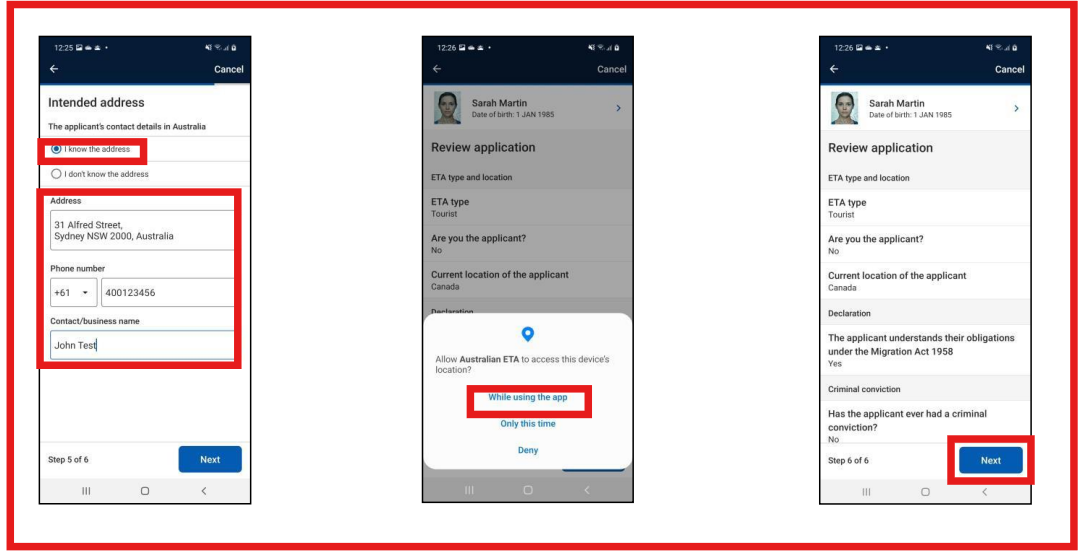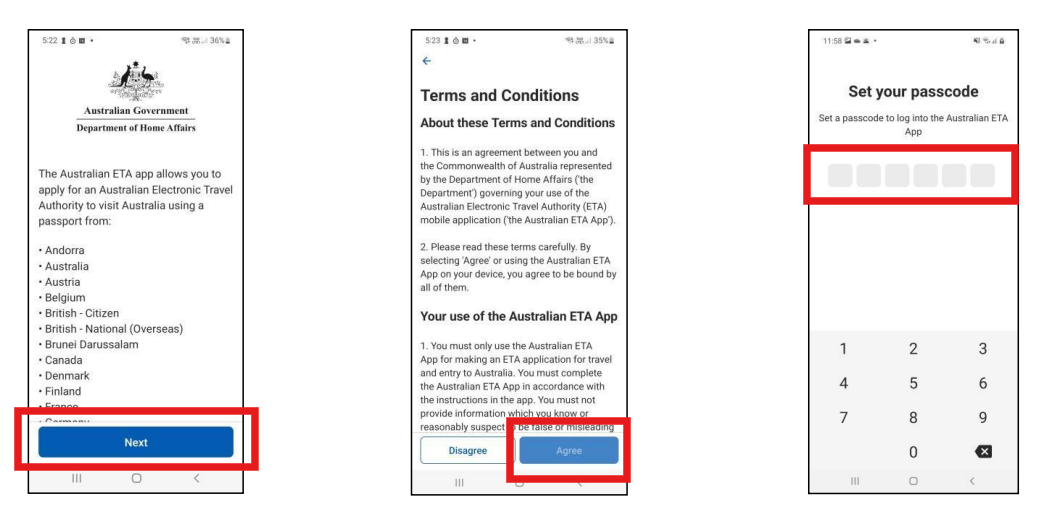 - 적격 국가, Australian ETA 앱 사용 약관 그리고 보안 설정 설정에 "next" "agree"를 클릭하세요.