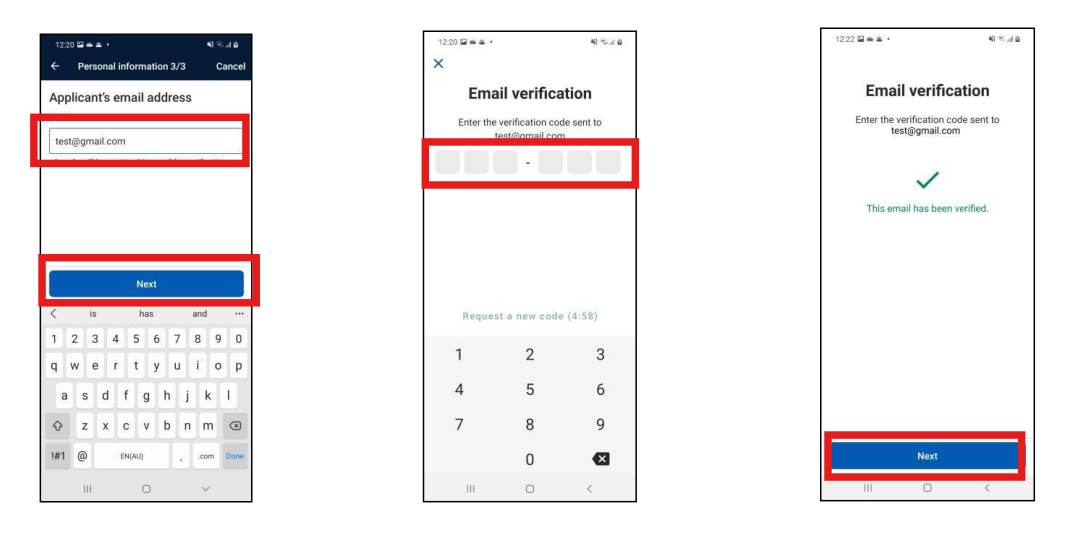- 한국 주소를 영어로, 휴대폰 번호 쓰고, Next 클릭하고 이메일까지 입력하시면 Email verification 화면으로!