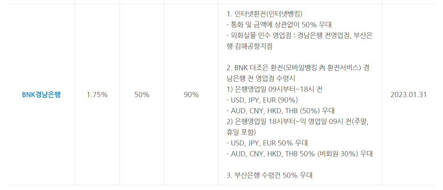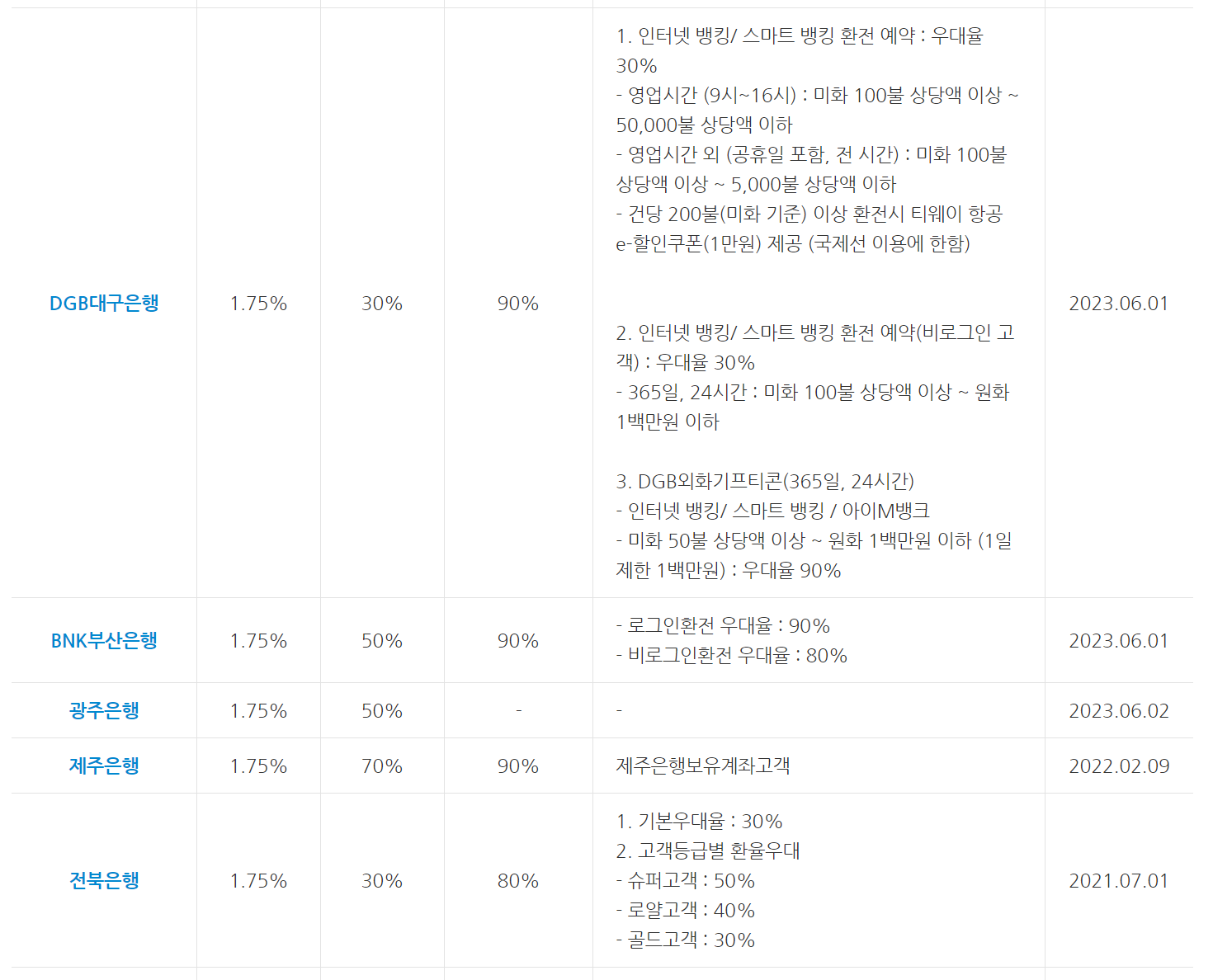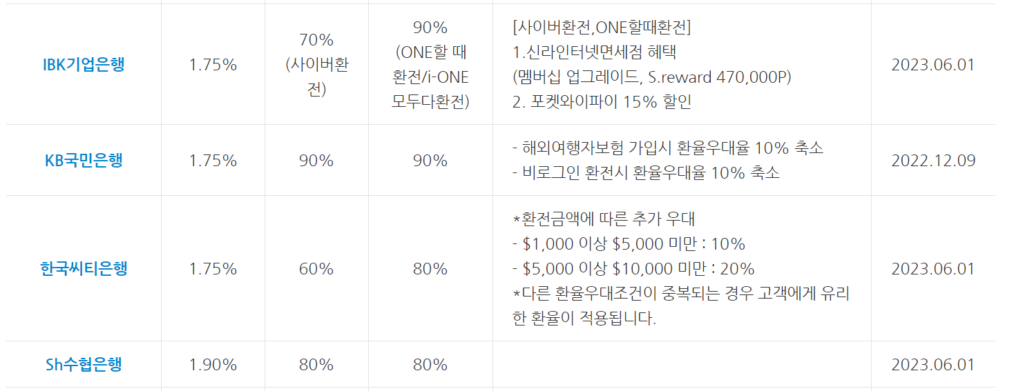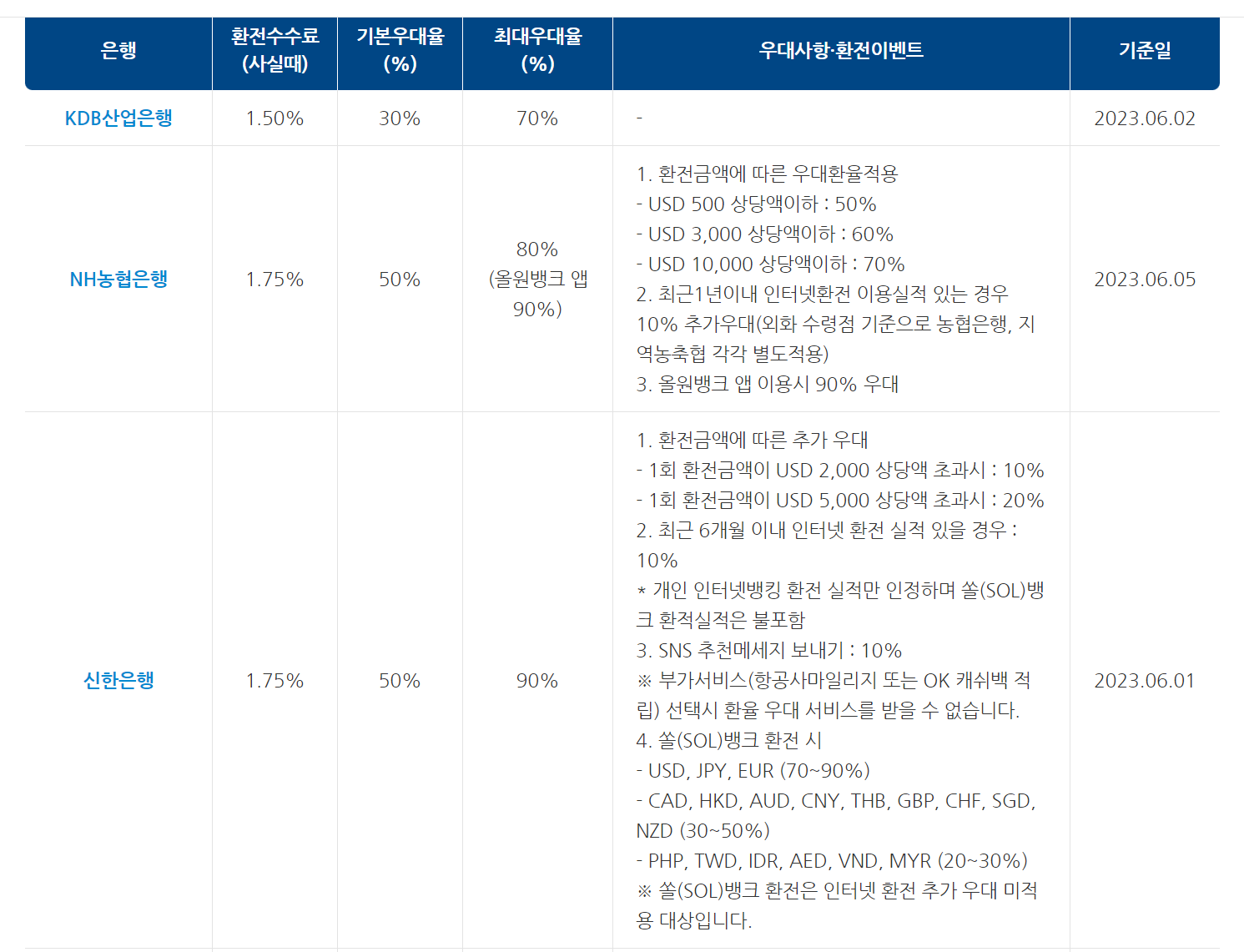 외환 길잡이 홈페이지 통해 먼저 현재 우대율 90% 이상인 은행을 찾고, 해당 은행중에서 우대 사항이나 이벤트를 잘 확인하고 자신에게 가장 유리한 은행 2~3개 선별해 해당 은행 홈페이지에 들어가 한번 더 확인을 하고 환전을 진행하는 걸 추천드립니다.