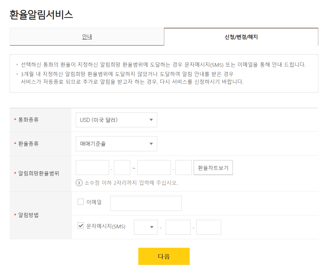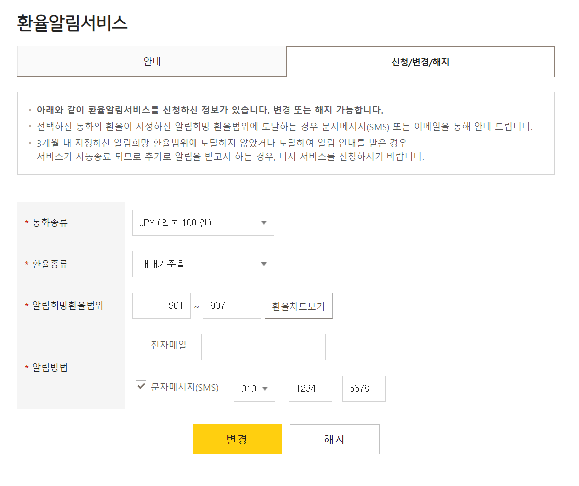 신청을 하고 나서 통화종류(달러, 엔화, 유로, 파운드 등등), 환율종류(매매기준율, 현찰 사실 때/파실 때, 전신환 보내실 때/ 받으실 때), 알림 희망환율 범위, 알림방법(이메일, 문자메시지)을 바꾸고 싶으면 입력하고 변경이나 해지를 클릭하면 됩니다.
