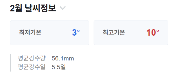 - 도쿄의 2월은 평균 최저기온 2.9℃, 평균 최고기온은 10.4℃로 우리나라의 3월 날씨와 비슷합니다. 평균 일교차는 7.5℃입니다. 평균 강수량은 56.1mm로 적은편이며 평균 강수일수는 5.5일입니다.