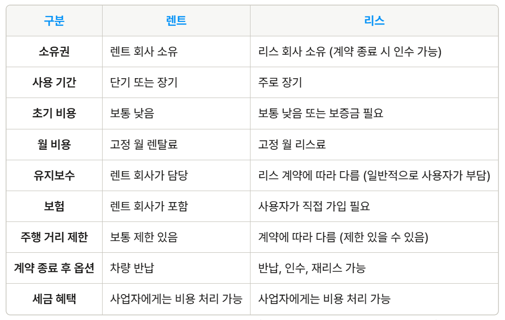 결국, 단기적 필요와 유연성을 중시하면 렌트, 장기적 사용과 경제성을 중시하면 리스가 더 나은 선택이 될 수 있습니다. 각자의 상황에 맞게 신중히 고려하여 결정하시기 바랍니다.