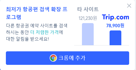 - 트립 닷컴도 종종 이용하는데요. 최저가 항공편 검색 확장 프로그램을 설치할 수 있어 쉽게 땡처리 최저가 항공권을 검색할 수 있어 편리해요.