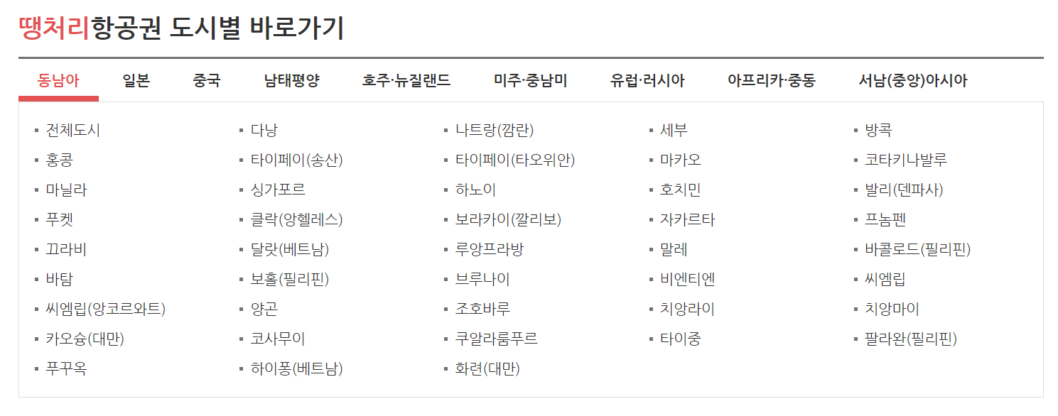 - 땡처리 특화된 '땡처리닷컴' 사이트를 이용하면 나라별/ 지역별 땡처리 현황을 살펴볼 수 있어 편리합니다.