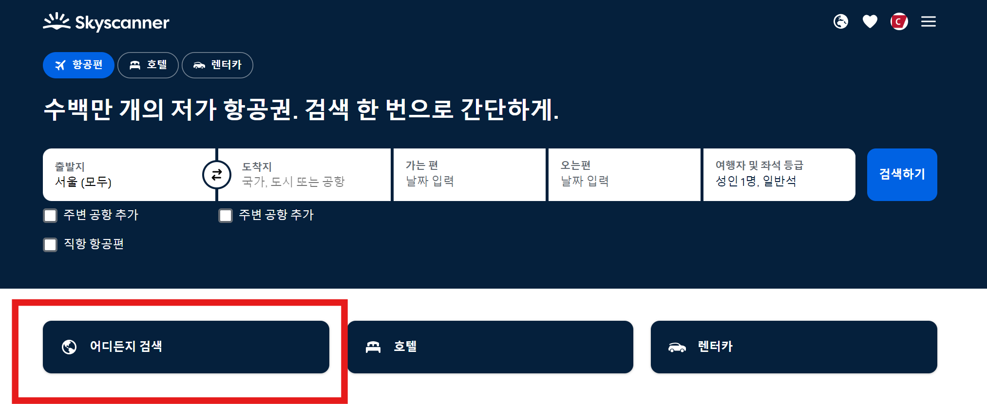 - 정해진 여행 목적지가 없고 유연하게 날짜도 정할 수 있다면, "어디든지" 검색 기능을 통해 최저가 항공권 찾을 수 있습니다.