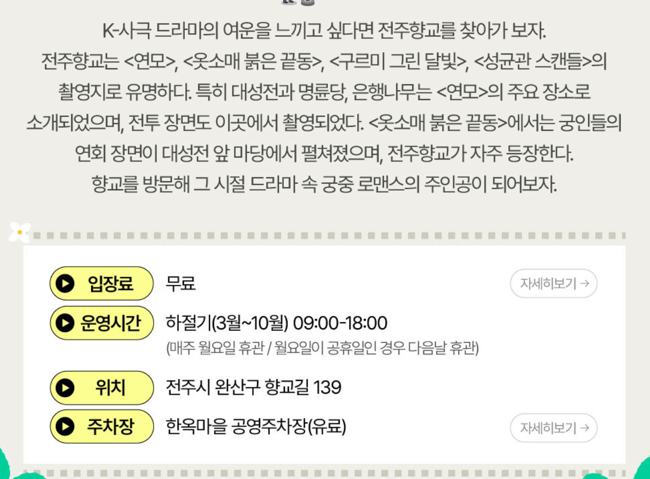 한복 체험: 전주한옥마을에서 한복을 대여해 입고 산책할 수 있습니다.