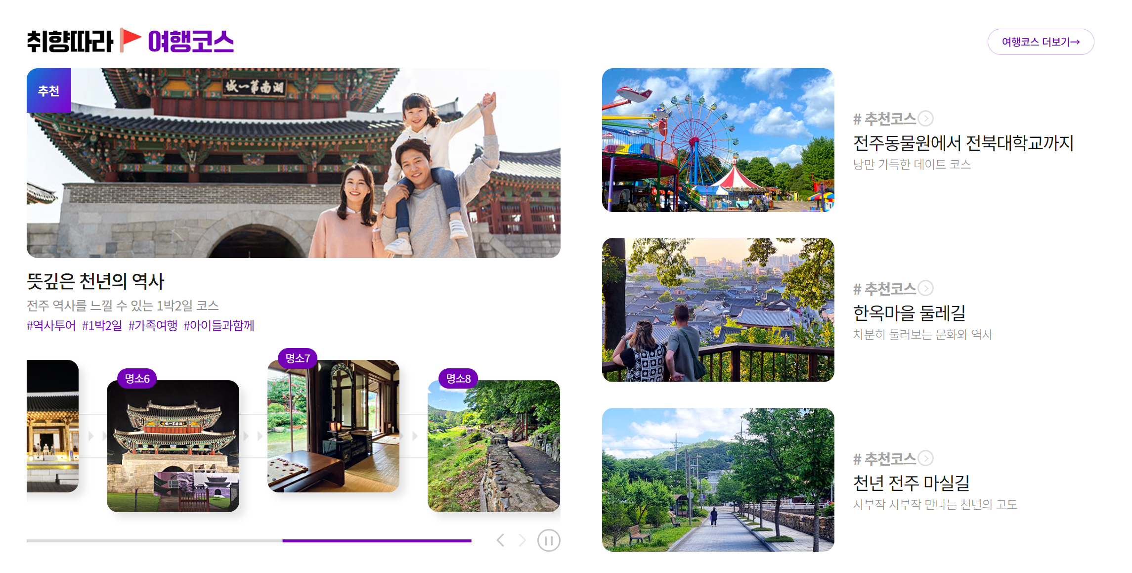 전주는 한옥마을로 유명한 도시로, 전통 한옥에서 하룻밤을 묵으며 전통문화를 체험할 수 있습니다. 전주한옥마을에서는 한복체험, 전통공예 체험, 전주비빔밥과 같은 전통음식을 맛볼 수 있습니다. 또한, 경기전, 전동성당, 풍남문 등 역사적인 명소들도 많습니다.