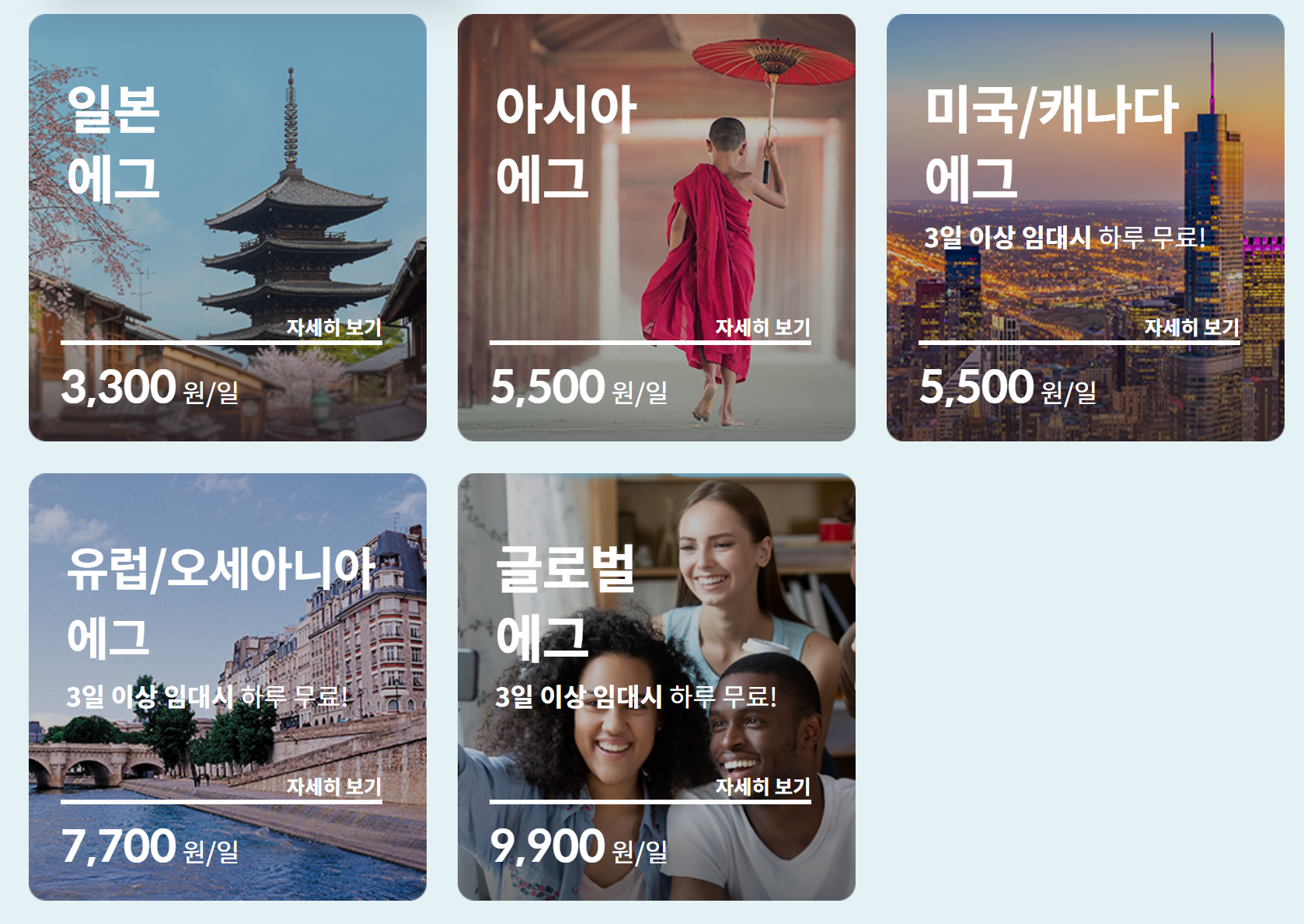 ※ 3일 이상 임대 시 하루를 무료로 이용하실 수 있습니다. (단 일본/ 아시아 에그 제외)