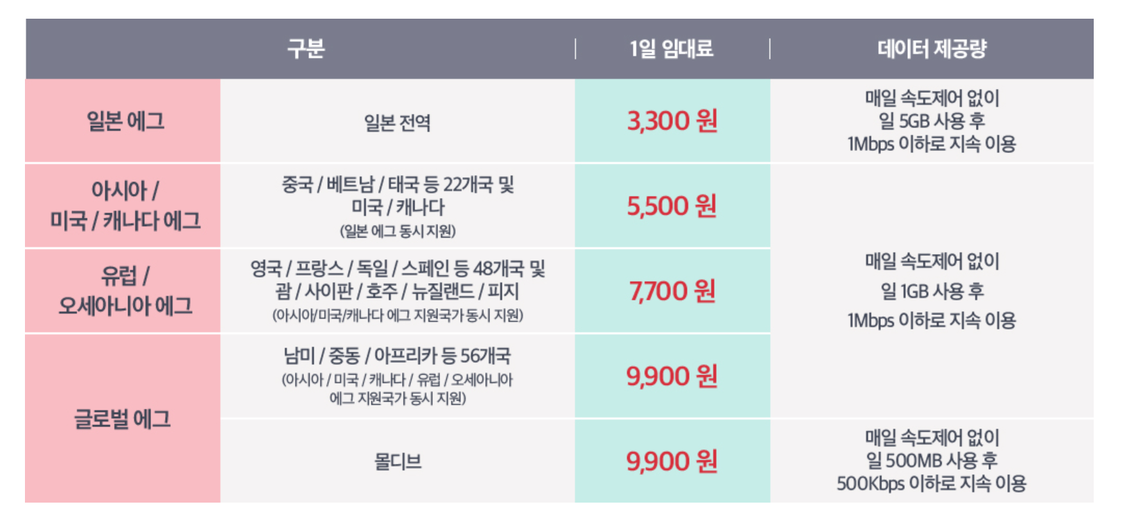 [ 국가별 로밍에그 옵션 ] ![]() * 3일 이상 임대 시, 하루를 무료로 이용하실 수 있습니다. (단, 일본 에그, 아시아 에그는 제외) * 상품별 지원국가는 아래에서 확인 가능합니다. |
