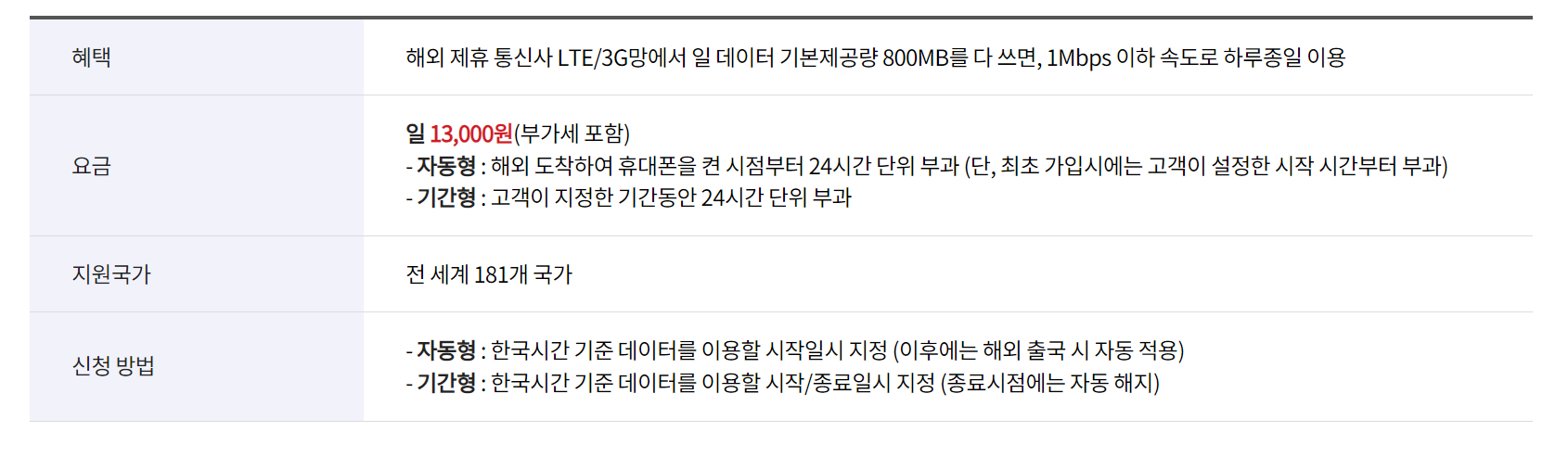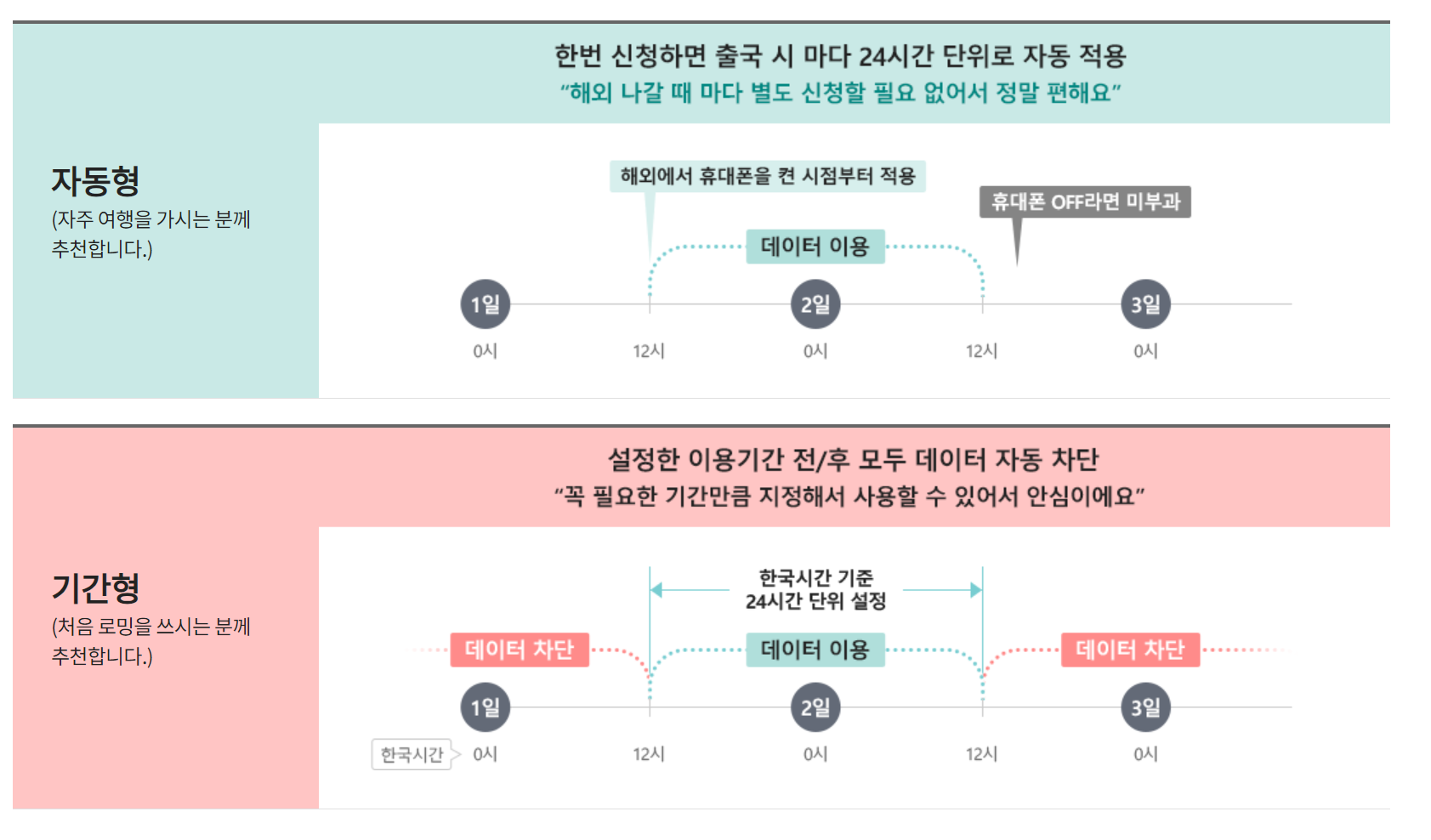 - 기간형: 설정 기간 종료 시 자동 해지 및 데이터로밍 차단 되며, 데이터 차단 기능은 귀국 후 별도 절차 없이 해제됩니다.