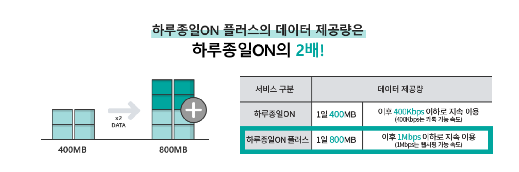 - 일 데이터 기본 제공량(800MB)을 다 쓰면, 1 Kbps 이하 속도로 하루종일 이용 가능합니다.