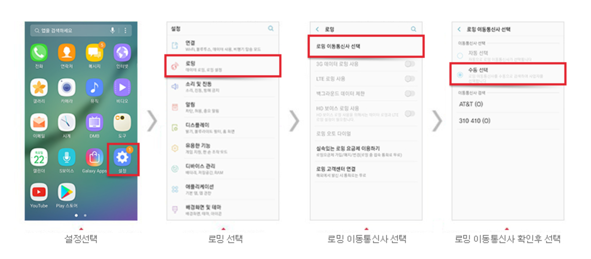 - Android설정 > 로밍 > 로밍 이동통신사 선택 > 로밍 이동통신사 확인 후 선택